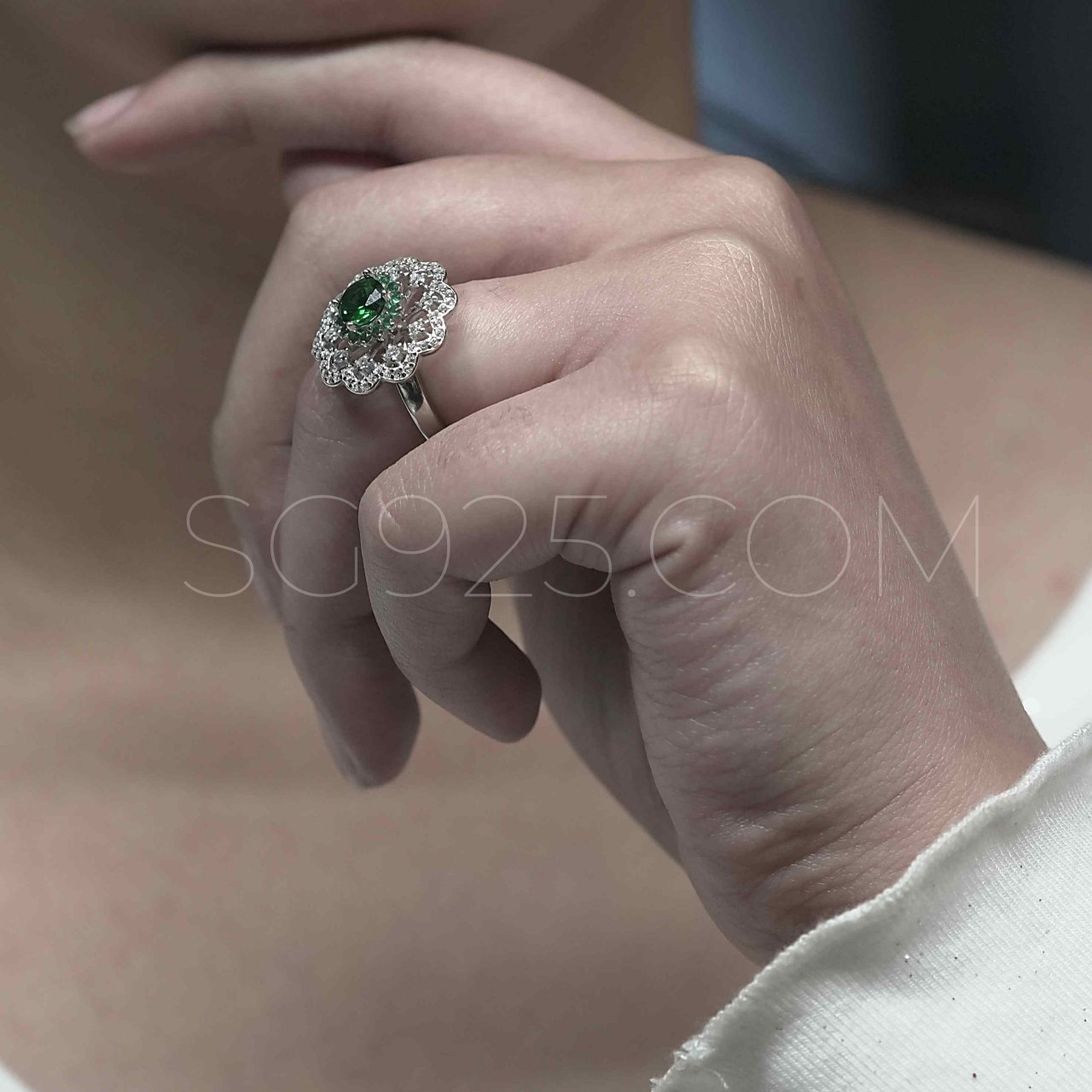 Silver Royal Green Cutstone AD Modern Floral Rotatable Ring